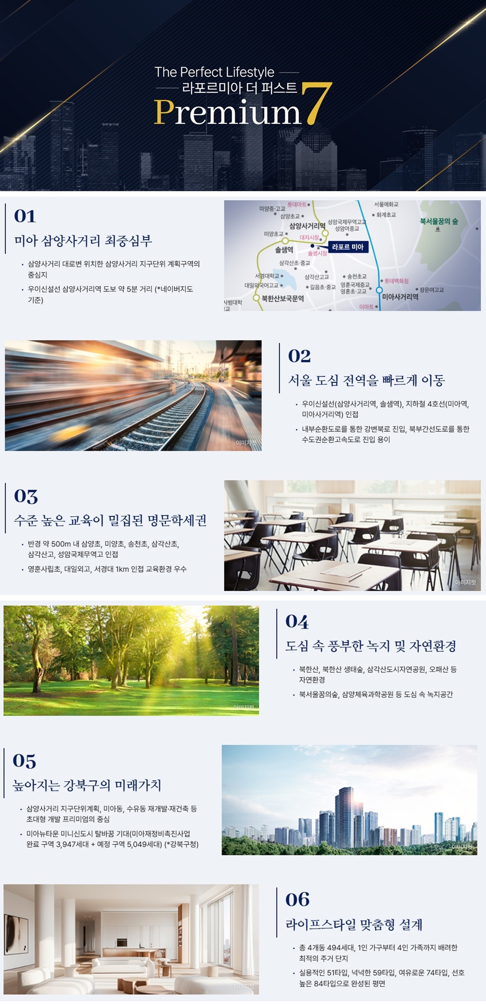 지하철 4호선 미아역 초역세권 입지 서울 도심을 빠르게 연결하는 압도적인 교통의 중심 미아역이 도보권에 위치하여 동대문, 종로, 명동 등 서울 주요 업무지구로의 출퇴근이 매우 편리한 직주근접 환경을 자랑합니다. 미아사거리역 상권과 몰세권 인프라 백화점부터 전통시장까지 모두 누리는 풍요로운 생활 현대백화점, 롯데백화점, 이마트, 와이스퀘어 등 대형 쇼핑 시설과 전통시장이 인접하여 완성된 생활 편의를 누릴 수 있습니다. 강북권 개발의 핵심 미아 뉴타운 비전 주변 정비사업과 연계된 지속적인 미래 가치 상승 인근 대규모 뉴타운 개발과 역세권 활성화 사업을 통해 동네 전체의 지도가 바뀌는 눈부신 가치 상승의 수혜를 입게 됩니다. 북서울꿈의숲과 북한산의 힐링 환경 도심 속에서 자연의 여유를 누리는 쾌적한 숲세권 서울의 대형 공원인 북서울꿈의숲과 북한산 국립공원이 인접하여 도심 생활 속에서도 맑은 공기와 건강한 여가 활동이 가능합니다. 대학가와 직장인을 아우르는 배후 수요 탄탄한 임대 수요층 확보로 안정적인 투자 가치 실현 인근 다수의 대학교와 병원 종사자, 도심 직장인 등 풍부한 주거 수요를 기반으로 공실 걱정 없는 안정성을 확보했습니다. 감각적인 공간 설계와 하이엔드 주거 공간 효율을 높인 혁신 평면과 고품격 인테리어 적용 트렌디한 주거 라이프를 반영한 평면 구성과 세련된 마감재를 사용하여 입주민의 자부심과 편의성을 극대화했습니다. GTX-C 노선 개발의 간접 수혜 권역 광역 교통망 확충에 따른 광역 접근성 개선 기대 인근 창동역 GTX-C 노선과 동북선 경전철 등 강북권 광역 교통망 확충의 긍정적인 파급 효과를 직접적으로 체감하게 됩니다.