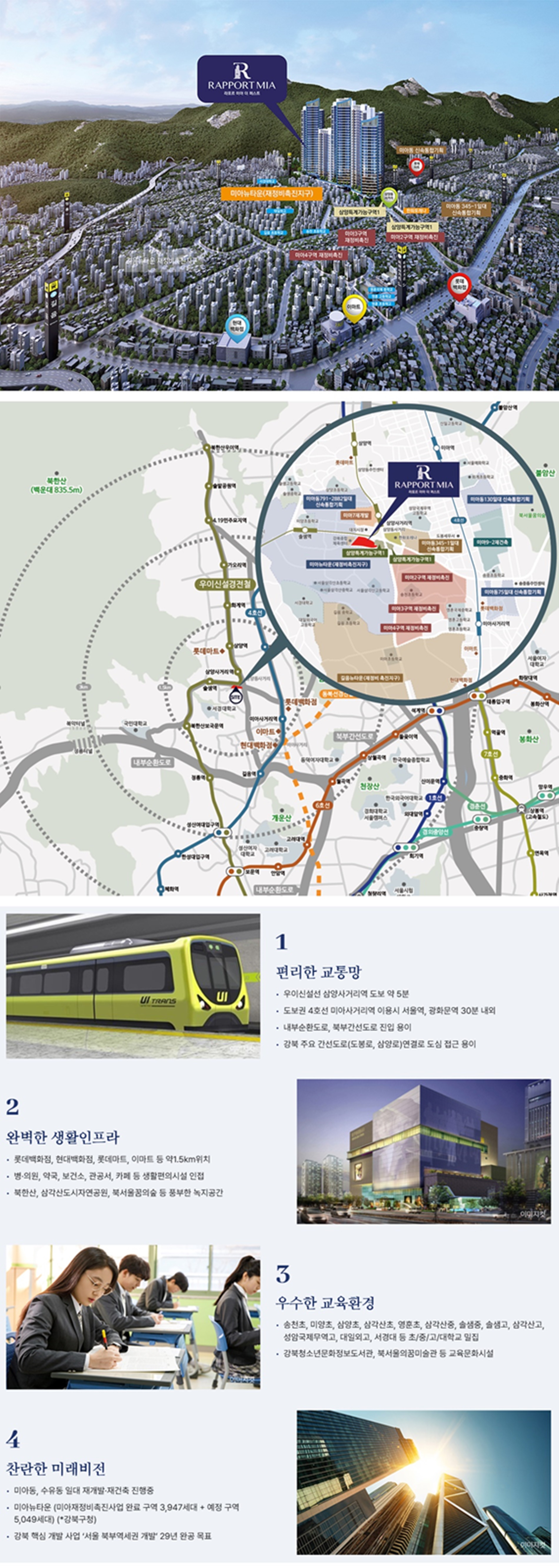 SPECIAL 01 라포르 미아 더퍼스트 브랜드가 완성하는 랜드마크의 품격 도심 속 새로운 중심, 브랜드 가치와 상징성을 모두 갖춘 프리미엄 주거 랜드마크입니다. 더 알아보기 SPECIAL 02 도심을 빠르게 잇는 초연결 교통 프리미엄 확장되는 교통망과 풍부한 생활 인프라가 만나는 핵심 입지, 미래의 중심에서 새로운 가치를 누리세요. 더 알아보기 SPECIAL 03 합리적인 분양 혜택과 스마트 금융 프로그램 맞춤형 금융 혜택과 유연한 분양 조건으로 초기 부담은 낮추고, 기회는 높였습니다. 더 알아보기 SPECIAL 04 세심한 설계로 완성된 품격 있는 주거공간 라포르 미아 더퍼스트 효율적인 공간 구성과 쾌적한 환경 설계로 일상의 여유와 만족을 더했습니다. 더 알아보기 SPECIAL 05 미래를 선도하는 가치, 지속되는 개발의 중심 라포르 미아 더퍼스트 풍부한 개발 호재와 성장 잠재력을 품은 입지로 높은 미래 가치를 기대할 수 있습니다. 더 알아보기 SPECIAL 01 라포르 미아 더퍼스트 브랜드가 완성하는 랜드마크의 품격 도심 속 새로운 중심, 브랜드 가치와 상징성을 모두 갖춘 프리미엄 주거 랜드마크입니다. SPECIAL 02 도심을 빠르게 잇는 초연결 교통 프리미엄 확장되는 교통망과 풍부한 생활 인프라가 만나는 핵심 입지, 미래의 중심에서 새로운 가치를 누리세요. SPECIAL 03 합리적인 분양 혜택과 스마트 금융 프로그램 맞춤형 금융 혜택과 유연한 분양 조건으로 초기 부담은 낮추고, 기회는 높였습니다. SPECIAL 04 세심한 설계로 완성된 품격 있는 주거공간 라포르 미아 더퍼스트 효율적인 공간 구성과 쾌적한 환경 설계로 일상의 여유와 만족을 더했습니다. SPECIAL 05 미래를 선도하는 가치, 지속되는 개발의 중심 라포르 미아 더퍼스트 풍부한 개발 호재와 성장 잠재력을 품은 입지로 높은 미래 가치를 기대할 수 있습니다.